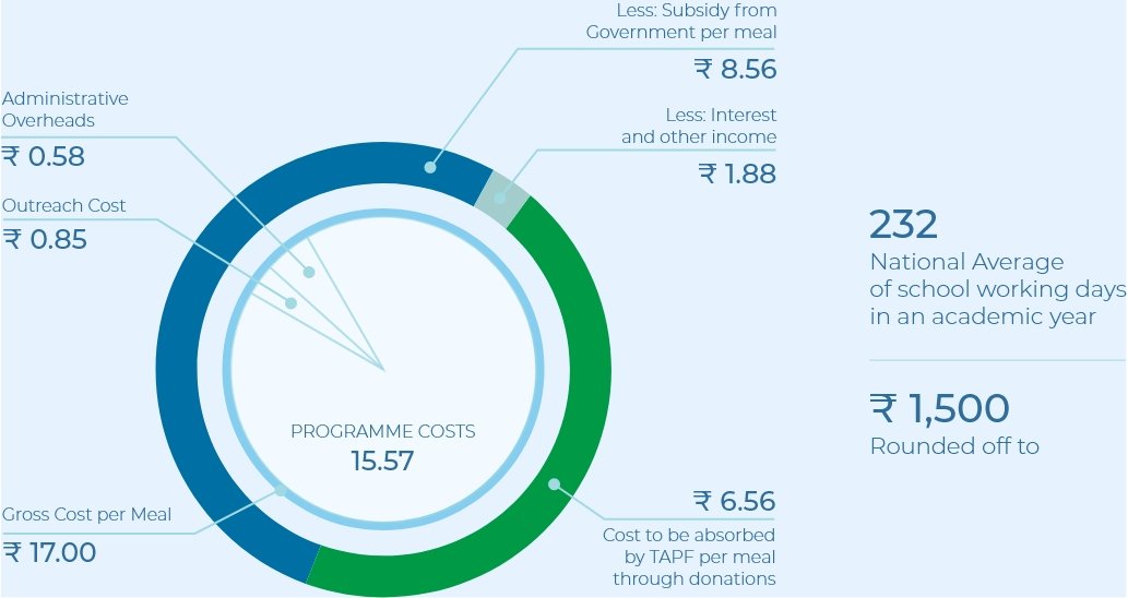 Our donors play a crucial role in what we are trying to achieve at The Akshaya Patra Foundation and we are grateful to them for their unwavering support. Accordingly, we strive to ensure utmost transparency and accountability in all matters related to fundraising and funds utilisation. On an average, 92% of the funds donated to the organisation are utilised towards meeting the programme cost and 8% towards programme management cost.