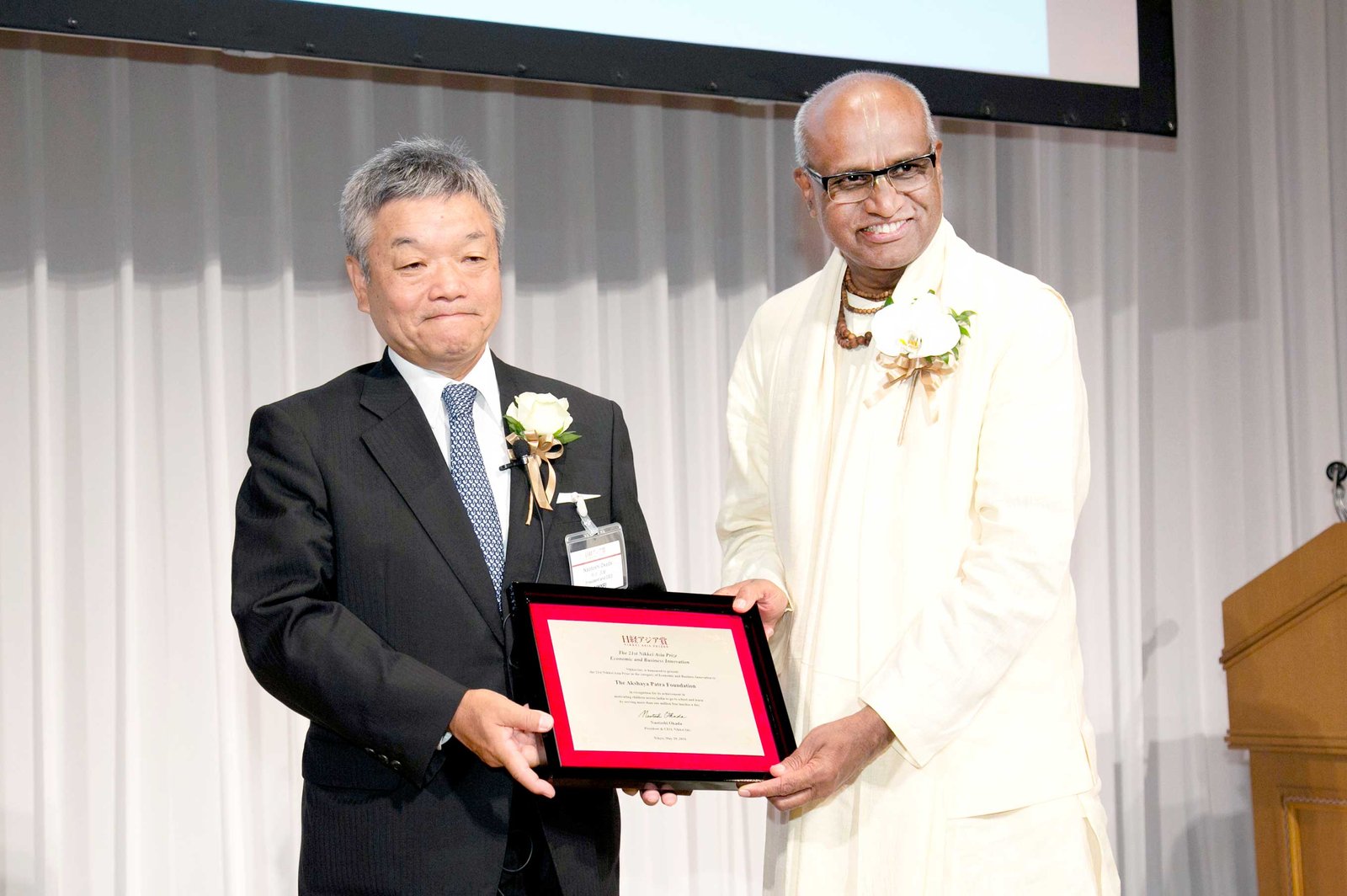 Madhu Pandit Dasa, Chairman of The Akshaya Patra Foundation receives the Nikkei Asia Prize on Sunday, May 29 in Tokyo. Naotoshi Okada, President, CEO of Nikkei Inc. presents the award at the ceremony.