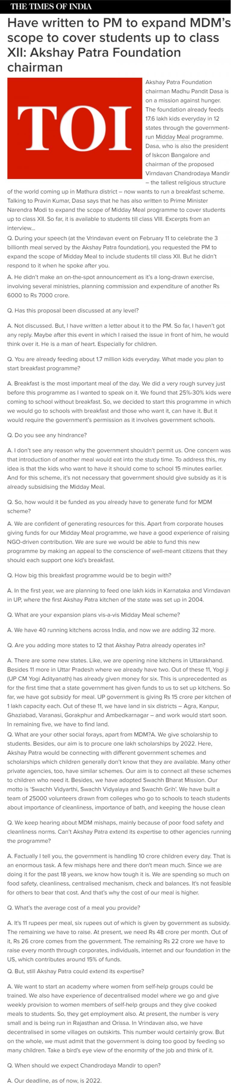 Have written to PM to expand MDM’s scope to cover students up to class XII: Akshay Patra Foundation