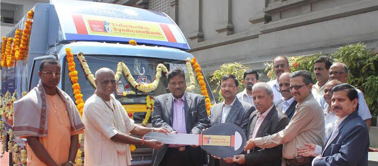 1 February, 2014: Syndicate Bank, one of the oldest banks of India, has contributed one meal distribution vehicle to The Akshaya Patra Foundation, the world’s largest NGO run school meal program which currently feeds over 1.3 million children across the country every day. Shri Sudhir Kumar Jain, Chairman along with Executive Directors Shri M. Anjaneya Prasad & Shri T. K. Srivastava& other top officials of Syndicate Bank flagged off the mid day meal vehicle in the presence of Shri. Madhu Pandit Dasa, Chairman, The Akshaya Patra Foundation.